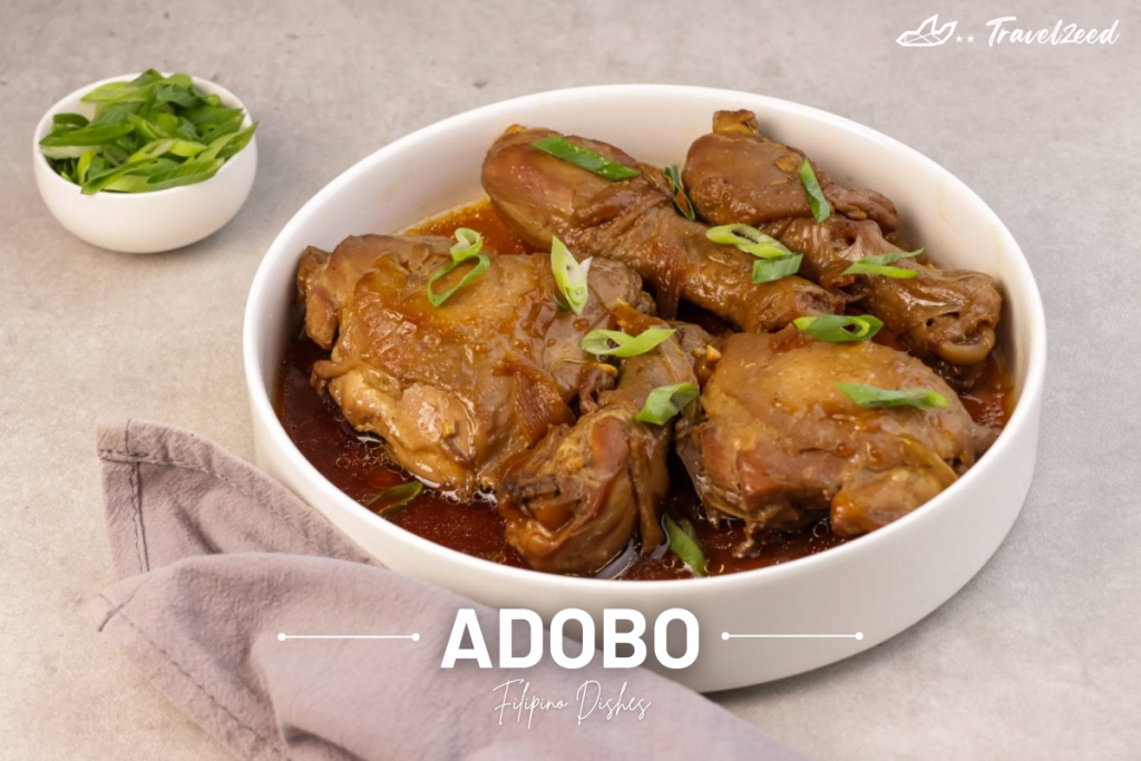 อาหารประจำชาติฟิลิปปินส์ คือ อโดโบ (Adobo) ซึ่งเป็นเนื้อสัตว์ เช่น หมูหรือไก่ ที่นำไปหมักกับส่วนผสมหลักอย่าง กระเทียม, ใบกระวาน, น้ำส้มสายชู และ ซีอิ๊วขาว ก่อนจะนำไปตุ๋นหรือทอดให้รสชาติเข้มข้นและนุ่ม เสิร์ฟพร้อมข้าวสวยร้อนๆ. อโดโบเป็นอาหารที่นิยมอย่างมากในฟิลิปปินส์ เพราะมีรสชาติเปรี้ยว เค็ม หวานเล็กน้อย และสามารถเก็บรักษาไว้ได้นาน เนื่องจากน้ำส้มสายชูมีคุณสมบัติในการถนอมอาหาร.