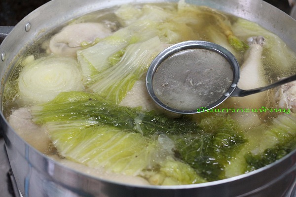 สุดท้ายลงไป ให้ลดไฟอ่อนลง จากนั้นต้มไปเรื่อย ๆ จนกว่าจะเดือด หมั่นช้อนฟองอากาศทิ้ง